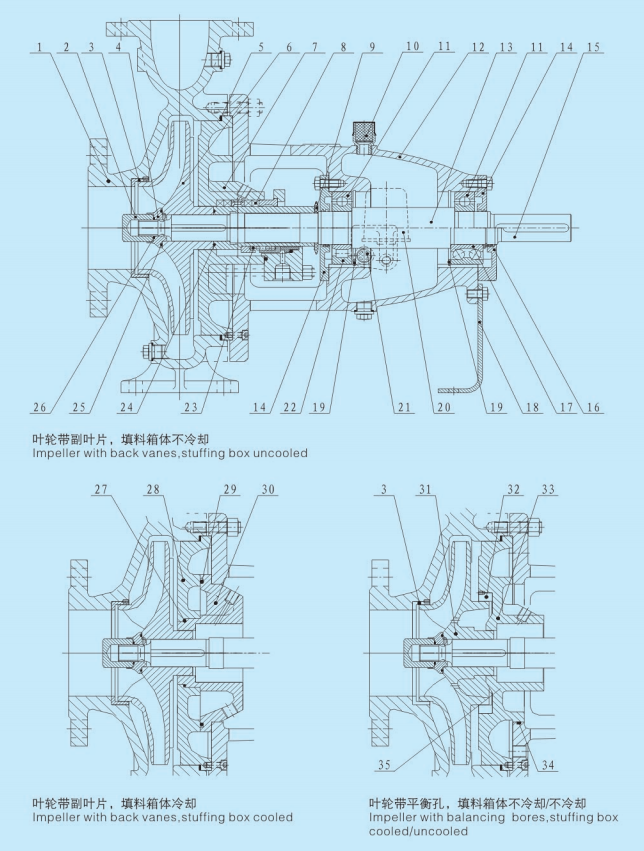 Hydraulic design the axial force is balanced by back vanes or balancing bores at the impeller. For some sizes, the casing is designed double volute to compensate the radial forces.