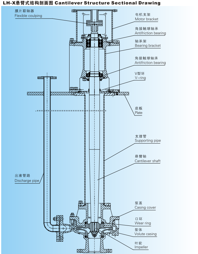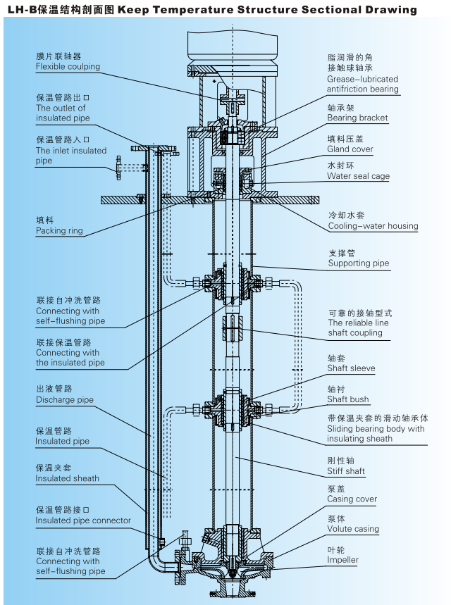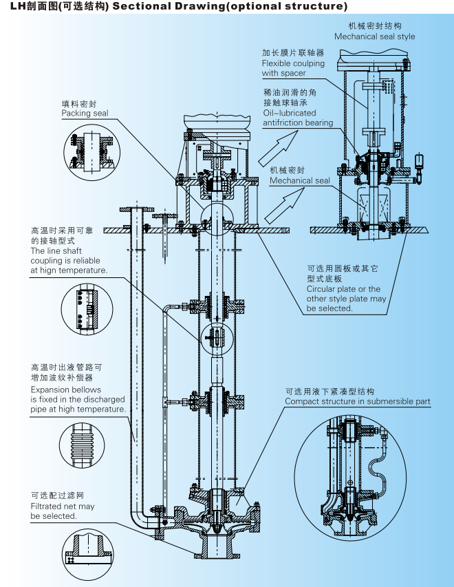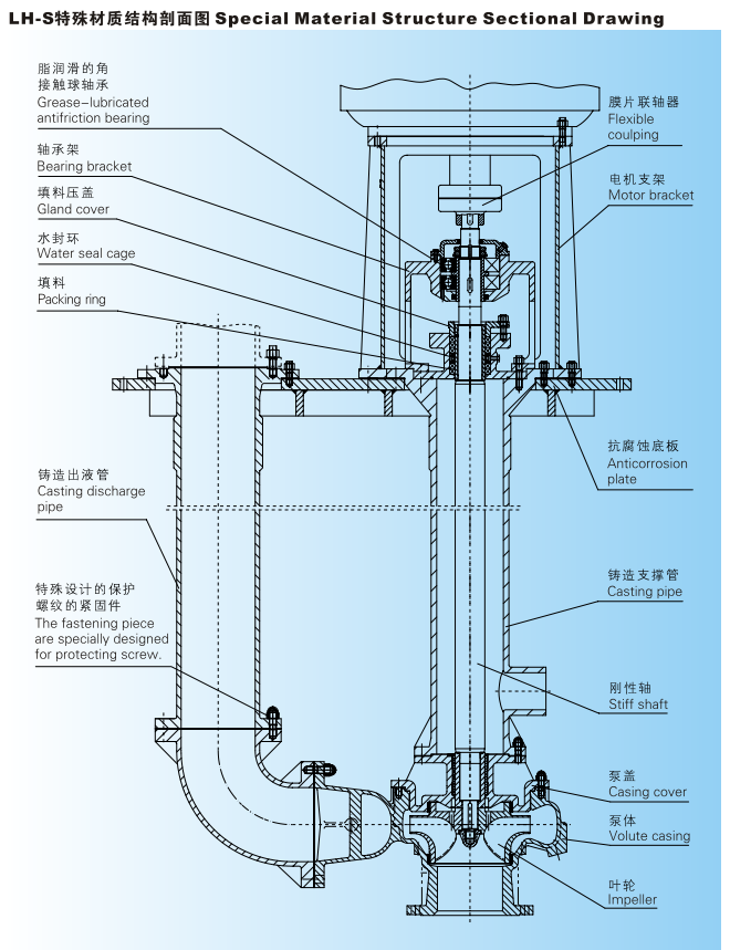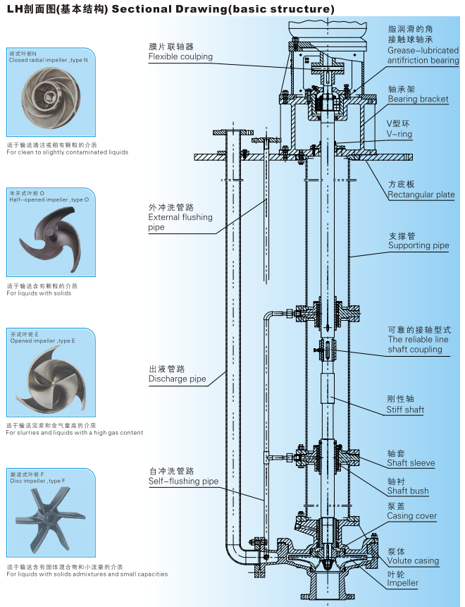 LH series pump is designed for most liquid transportation such as various cleaning or contain the solid particle liquid,the normal temperature or high temperature liquid neuter or corrosive liquid etc.The pump canbe used on opening sumppool orclosed pressure container.